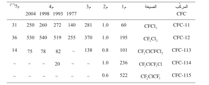 الجدول 1.3 خواص مركبات فلورات الكربون الكلورية CFCs الشائعة(*) . المزج معطاة بالجزء الحجمي من التريليون pptv