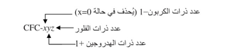 ويتحقق توازن الذرات اللازم للكربون المشبع بعدئذ بواسطة الكلور. ثمة طريقة سهلة لتحديد الصيغة الكيميائية من الرمز العددي لمركب CFC معيّن تتمثل بإضافة 90 إلى ذلك العدد. يعطي عندئذ العدد المعدل الثلاثي المنازل عدد ذرات الكربون والهدروجين والفلور على التتالي.