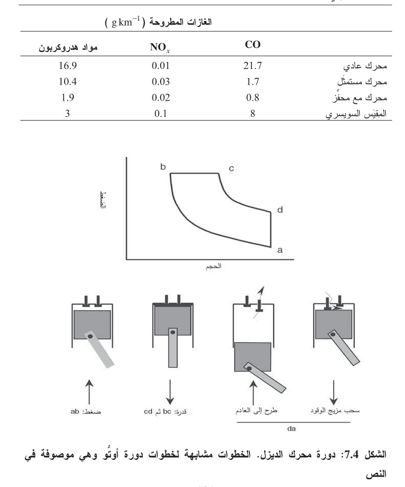 يحصل في الأسطوانة الممتلئة بالهواء ضغط حافظ للحرارة (ab) بنسبة ضغط تساوي 1:15. وفي نهاية الخطوة ab يُدخل الوقود إلى الأسطوانة. ويؤدي ضغطه إلى حجم صغير جداً إلى زيادة في درجة الحرارة حتى نحو 500 درجة مئوية ضمن الأسطوانة، فيشتعل الوقود تلقائياً وفورياً، ويحترق باستمرار في أثناء دفع المكبس إلى الأسفل في شوط القوة bc) إلى (cd). أما المدة التي يستغرقها حقن الوقود واحتراقه، فهي طويلة بقدر يكفي لبقاء الضغط في الأسطوانة ثابتاً تقريباً في المرحلة الأولية bc من التمدد وفي النهاية يحصل طرح نواتج الاحتراق ويتبعه سحب هواء جديد (da). يُستعمل في محرك الديزل وقود ذو جودة أقل ودرجة غليان أعلى من نظيرتيهما في البنزين المستعمل في المحركات السابقة. وتؤدي نسبة الضغط العالية إلى تكون مصدر طاقة أعلى كفاءة المعادلة (51.4)، لكنها تتطلب أيضاً أن تكون بنية المحركة قوية كي تتحمل الضغط المتولّد في الأسطوانة. ونظراً إلى أن الوقود يُحقن عند اكتمال شوط الضغط، يكون امتزاج الوقود بالهواء غير تام إلى حد ما. لذا فإن إحدى المشاكل الرئيسية التي تظهر في محركات الديزل هي انبعاث هباب مؤلف من جسيمات كربون غير محترق (سخام) ومادة عضوية قابلة للانحلال في الماء. وتتألف المادة العضوية من مكونين هما وقود غير محترق أو محترق جزئياً على شكل هباب سائل، ومكون آخر يتجمع على جسيمات السخام. أما انبعاثات الهدروجين الغازية فهي هنا أقل من نظيرتها التي تنبعث من محركات البنزين بسبب درجة حرارة غليان وقود الديزل العالية. وتوجد أيضاً ضمن الهباب كبريتات غير عضوية لأن محتوى وقود الديزل من الكبريت (الذي يساوي عادة 0.1-0.3%) أعلى من ذاك الذي يوجد في معظم أنواع البنزين.