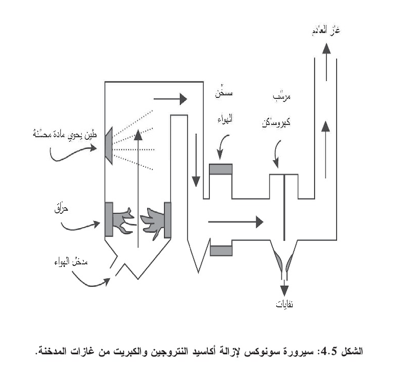 يضمن رش المُحسنات في الفرن عبر مرذاذ عالي الضغط تبخيراً سريعاً للمذيب و" تحطيماً" فعّالاً لكربونات الكالسيوم، لتكوين أكسيد الكالسيوم، واليوريا لتكوين جذر الأميدوجين (amidogen) التفاعلي (NHCON) يُري الشكل 4.5 رسماً توضيحياً للسيرورة.