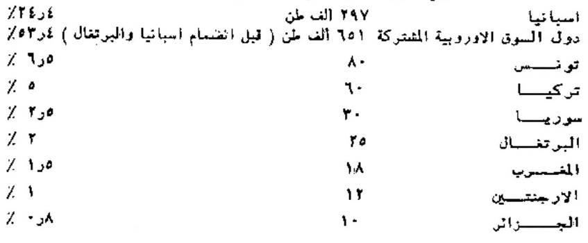 يتضح من الاحصائية أعلاها أن سورية تأتي في المرتبة السادسة في انتاج زيت الزيتون على أساس أن دول السوق الاوربية المشتركة الرئيسية قبل انضمام اسبانيا والبرتغال المنتجة لزيت الزيتون هي ايطاليا ثم اليونان 53.4%.