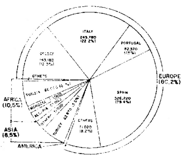 شكل يبين الانتاج العالمي من زيت الزيتون 1953 - 1954 وان 99٪ من الانتاج من حوض البحر المتوسط