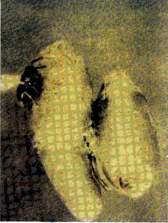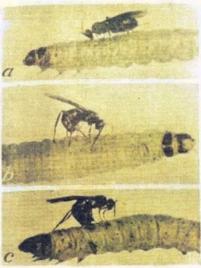 شكل انثى الطفيلي Bracon hebetor في حالة وضعها للبيض على يرقات عثة الطحين الهندية