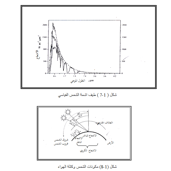 يعرف الإشعاع الشمسي بأنه الطاقة القادمة من الشمس . إذ أن مقدار الطاقة الواصلة إلى الأرض من الشمس هي 14 10 × 1.7 كيلو واط أي ما يقارب 18 10× 1.5 كيلو واط لكل سنة وهو اكبر بـ28000 مرة من الطاقة العالمية المستهلكة سنوياً . إن الطول الموجي للإشعاع الشمسي في الجو هو بين ( 0.2 – 50 ) مايكروميتر وينخفض هذا المدى إلى ( 0.3 – 3 ) مايكروميتر عند وصوله إلى سطح الأرض نتيجة لامتصاص جزء من هذا الإشعاع من قبل مكونات الجو المختلفة مثل الأوزون والاوكسجين وثاني اوكسيد الكاربون والبخار والغيوم , يسمى الاشعاع الشمسي الواصل إلى الأرض بدون أمتصاص أو استطارة بالأشعاع المباشر (Direct Radiation ) أما الأشعاع الواصل إلى الأرض بطريق الانتشار فيسمى بالأشعاع النافذ (Diffuse Radiation) ومجموع هذين الاشعاعين يسمى بالأشعاع الكروي أو الأشعاع الشامل (Global Radiation) . ان نسبة الشعاع المباشر في الشعاع الكروي واطئة في الأيام الغائمة والعكس في الأيام المشمسه . الشكل (1-7) يبين الطيف الشمسي القياسي في حين يبين الشكل (1-8) الطيف الشمسي عندما تكون الشمس بزاوية ذروة مقدارها (48.19)5 إذ تقابل زاوية الذروة كتلة الهواء