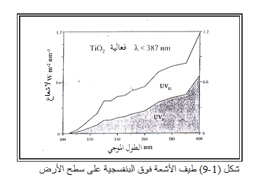 (1-9) نوعين من الطيف هما طيف الإشعاع المباشر (UVD) وطيف الإشعاع الكروي (UVG) اذ يظهران بحدود (300-400) نانوميتر ويبين هذا المدى الطاقة المتوافرة في الشمس لإجراء التفاعلات الضوئية المحفزة باستخدام TiO2 أو ZnO وبوجود الأشعة فوق البنفسجية وعند طول موجي 387 نانوميتر(1) . تتغير قيمة الأشعة فوق البنفسجية الموجودة في الإشعاع الشمسي بتغير الموقع وباختلاف فصول السنة والساعة خلال اليوم الواحد .