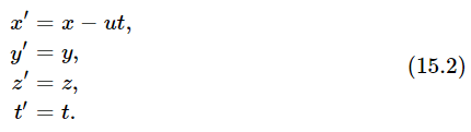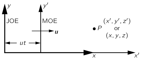 Suppose that Moe is moving in the x–direction with a uniform velocity u, and he measures the position of a certain point, shown in Fig. 15–1. He designates the “x–distance” of the point in his coordinate system as x′. Joe is at rest, and measures the position of the same point, designating its x–coordinate in his system as x. The relationship of the coordinates in the two systems is clear from the diagram. After time t Moe’s origin has moved a distance ut, and if the two systems originally coincided,
