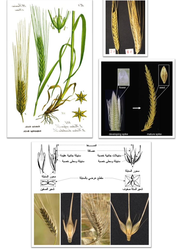 4. السنابل (النورة) تختلف حسب الصنف في الشعير ذي الستة صفوف تكون السنيبلات عند كل عقدة خصبة حيث تتكون في كل منها حبة واحدة، اما الشعير ذي الصفين فأن السنيبلة الوسطية فقط هي الخصبة حيث تتكون بها حبة، اما السنيبلات الجانبية فهي عقيمة ولا تتكون بها الحبوب.