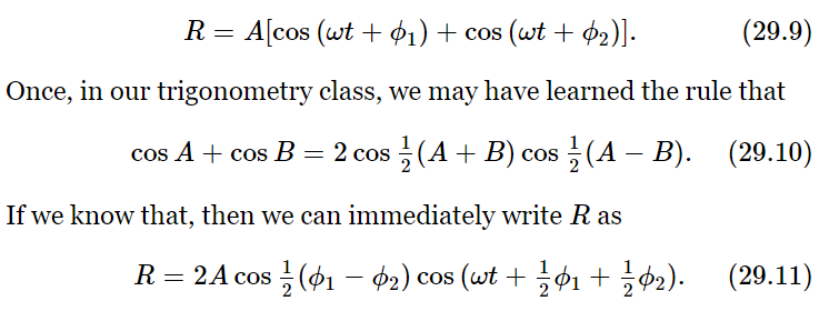 Now suppose that we cannot remember that the sum of two cosines is twice the cosine of half the sum times the cosine of half the difference. Then we may use another method of analysis which is more geometrical. Any cosine function of ωt can be considered as the horizontal projection of a rotating vector. Suppose there were a vector A1 of length A1 rotating with time, so that its angle with the horizontal axis is ωt+ϕ1. (We shall leave out the ωt in a minute, and see that it makes no difference.) Suppose that we take a snapshot at the time t=0, although, in fact, the picture is rotating with angular velocity ω (Fig. 29–9). The projection of A1 along the horizontal axis is precisely A1cos(ωt+ϕ1). Now at t=0 the second wave could be represented by another vector, A2, of length A2 and at an angle ϕ2, and also rotating. They are both rotating with the same angular velocity ω, and therefore the relative positions of the two are fixed. The system goes around like a rigid body. The horizontal projection of A2 is A2cos(ωt+ϕ2). But we know from the theory of vectors that if we add the two vectors in the ordinary way, by the parallelogram rule, and draw the resultant vector AR, the x-component of the resultant is the sum of the x-components of the other two vectors. That solves our problem. It is easy to check that this gives the correct result for the special case we treated above, where A1= A2= A. In this case, we see from Fig. 29–9 that AR lies midway between A1 and A2 and makes an angle 1/2 (ϕ2−ϕ1) with each. Therefore, we see that AR=2A cos 1/2 (ϕ2−ϕ1), as before. Also, as we see from the triangle, the phase of AR, as it goes around, is the average angle of A1 and A2 when the two amplitudes are equal. Clearly, we can also solve for the case where the amplitudes are not equal, just as easily. We can call that the geometrical way of solving the problem.