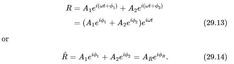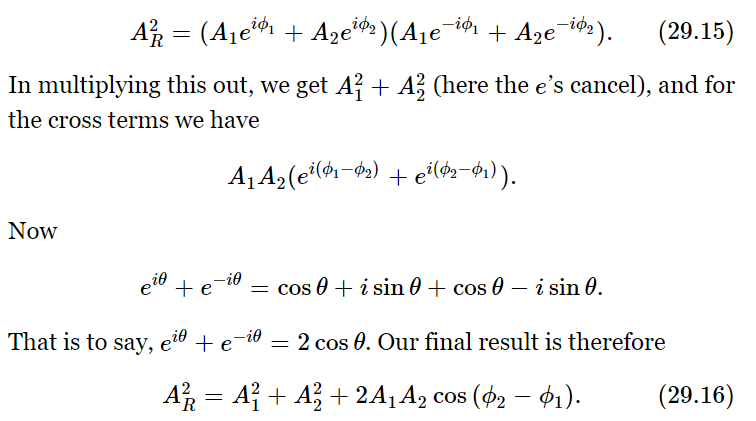 There is still another way of solving the problem, and that is the analytical way. That is, instead of having actually to draw a picture like Fig. 29–9, we can write something down which says the same thing as the picture: instead of drawing the vectors, we write a complex number to represent each of the vectors. The real parts of the complex numbers are the actual physical quantities. So, in our particular case the waves could be written in this way: A1ei(ωt+ϕ1) [the real part of this is A1cos(ωt+ϕ1)] and A2ei(ωt+ϕ2). Now we can add the two:
