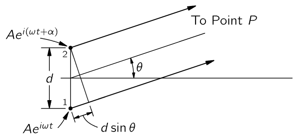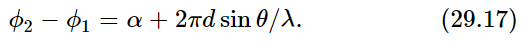 Now let us see how to apply our general formula (29.16) for the case of two oscillators to the special situations which we have discussed qualitatively. To apply this general formula, it is only necessary to find what phase difference, ϕ2−ϕ1, exists between the signals arriving at a given point. (It depends only on the phase difference, of course, and not on the phase itself.) So let us consider the case where the two oscillators, of equal amplitude, are separated by some distance d and have an intrinsic relative phase α. (When one is at phase zero, the phase of the other is α.) Then we ask what the intensity will be in some azimuth direction θ from the E–W line. [Note that this is not the same θ as appears in (29.1). We are torn between using an unconventional symbol like U, or the conventional symbol θ (Fig. 29–10).] The phase relationship is found by noting that the difference in distance from P to the two oscillators is d sinθ, so that the phase difference contribution from this is the number of wavelengths in d sinθ, multiplied by 2π. (Those who are more sophisticated might want to multiply the wave number k, which is the rate of change of phase with distance, by d sinθ; it is exactly the same.) The phase difference due to the distance difference is thus 2πd sinθ/λ, but, due to the timing of the oscillators, there is an additional phase α. So the phase difference at arrival would be