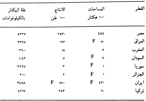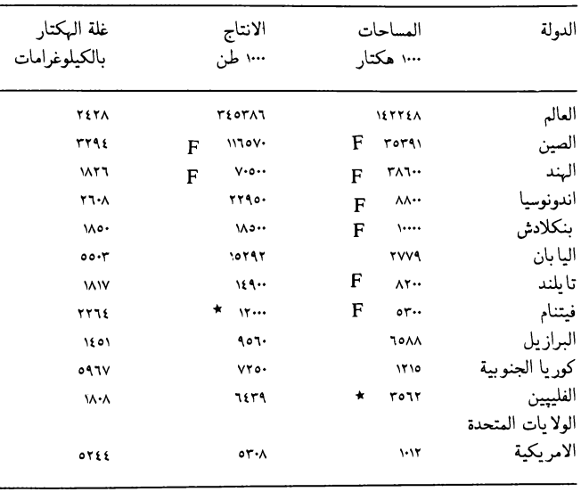 جدول ( 1 ) يبين المساحات والانتاج الكلي وغلة الهكتار للعالم والدول المهمة بإنتاج الرز (F.A.O. 1976).