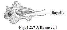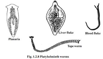 This phylum includes flatworms. These are acoelomates, without a body cavity called coelom. The alimentary canal is either absent or very simple. Excretion and osmoregulation occur through flame cells. These worms are mostly hermophrodites, having both male and female reproductive organs in a single individual. Most of the members are parasites. It is divided into three classes, namely Turbellaria, Trematoda and Cestoda.