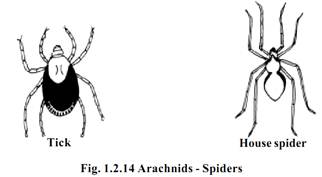 Class Arachnida: - It includes scorpions, spiders, ticks and mites. The body is divided into cephalothorax and abdomen. There are four pairs of legs attached to the cephalothorax.