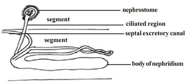 A typical nephridium has an internal funnel like opening called the nephrostome. It is fully ciliated. The nephrostome is in one segment and the rest of the tube will be in the succeeding segment. This tube has three distinct