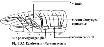 The brain is formed of the supra pharyngeal ganglia. It is a bilobed mass of nervous tissue situated on the dorsal wall of the pharynx in 3rd segment. The ganglia found below the pharynx in the 4th segments is called the subpharyngeal ganglia. The brain and the subpharyngeal ganglia are connected by a pair of circum pharyngeal connectives. They run one on each side of the pharynx. Thus a nerve ring is formed around the anterior region of the alimentary canal. The double, solid ventral nerve cord runs backwards from the subpharyngeal ganglia, in the mid ventral line to the hind end of the body. The ventral nerve cord has segmental ganglion one in each segment. From the brain nerves are given off to the peristomium. From each ganglion of the ventral nerve cord, three pairs of nerves are given off to the body wall and other organs.