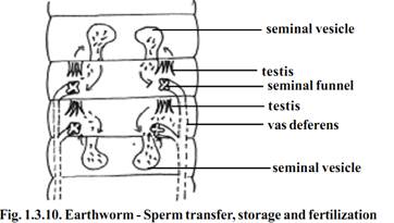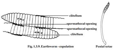 During copulation the head ends of the two worms are directed in the opposite directions and the clitellum of one worm is opposite to the Spermathecal segments of the other. The spermatozoa of one worm pass into the spermathecae of the other worms. The worms separate after the mutual exchange of spermatozoa.