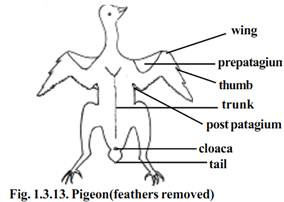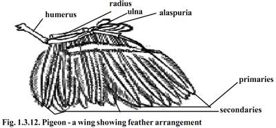 The forelimbs as modified wings are located in the anterior region of the trunk. The limbs are of the pentadactyl type. The wing has three typical divisions as - the upper arm, forearm and hand. The hand has three imperfectly marked digits. While the pigeon is at rest the three divisions of the wing are bent upon one another in the form of the letter ‘Z’. During flight the wings are straightened and extended. A fold of skin the alar membrane or prepatagium, stretches between the upper and forearm along the anterior border of the limb. A smaller fold known as postpatagium is present between the trunk and upperarm.