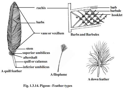 There are three types of feathers in pigeon. They are the large quill feathers found on wings and tail for flight, the contour feathers, forming a covering for the body and the filoplumes, lying between the contour feathers.