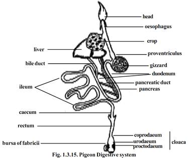 The alimentary canal proper starts from the Pharynx. The Pharynx leads into a long oesophagus that runs back through the neck. At the base of the neck region, it enlarges into a thin walled, distensible sac known as crop containing mucous glands. It serves as a store house for the food. The crop is followed by the stomach. The stomach is divisible into two parts, the anterior tubular proventriculus containing gastric glands and a posterior laterally compressed gizzard. The gizzard has a thick muscular wall and a horny inner lining. Its cavity is small and contains small stones which are helpful to grind the food. Thus the gizzard acts as a grinding mill. This type of arrangement is necessary because of the absence of teeth in the buccal cavity. The intestine arises from the right side of the gizzard. It is divisible into an anterior U- shaped duodenum, and a posterior long coiled ileum. The ileum enlarges posteriorly into a short rectum or large intestine. Anteriorly, the rectum bears a pair of small rectal caeca. The rectum opens to the exterior by the cloaca.