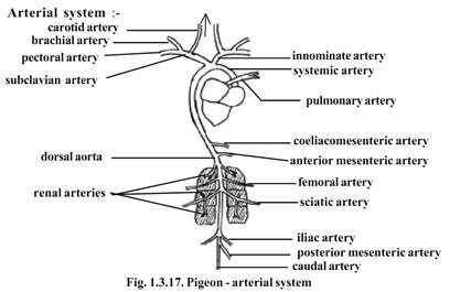From the right ventricle arises the pulmonary artery carrying deoxygenated blood to the lungs for purification. An aorta arises from the left ventricle (right systemic). It carries oxygenated blood to various regions of the body through several arteries.