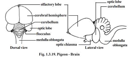The brain is divisible into the fore-, mid- and hind brains. The cerebral hemispheres are distinct. They are round and large in size. The olfactory lobes are very small and they do not contain cavities. The diencephalon is hidden from the view by the forward prolongation of the cerebellum. The diencephalon has the pineal body dorsally and infundibulum and pituitary body ventrally. The optic lobes are lateral in position owing to the large size of the cerebral hemispheres and cerebellum. The medulla oblongata instead of being continued backwards as in other tetrapods, descends almost vertically from the cerebellum