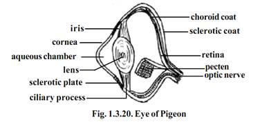 The eyes are large. During flight the eyes and their shape are protected by unique sclerotic plates of the outer eye layer. The nictitating membrane slides over the eyeball and presumably protects the cornea by closing it, during flight. Inside the eye, a vascular pigmented process projects into the vitreous body. It is known as the pecten. It arises from the point of entry of the optic nerve into the eye ball. Its function is not definitely known, but possibly it may help in long distance vision.