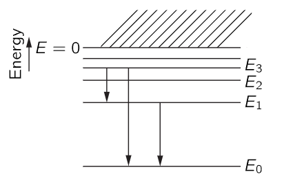 This, then, is a characteristic frequency of the atom and defines a spectral emission line. Another possible transition would be from E3 to E0. That would have a different frequency
