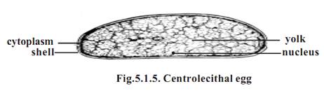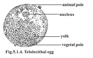 All eggs have polarity. In polarity, the eggs have an innate nature for to be differentiated into upper animal pole and lower vegetal pole. The polar nature is mainly due to the denser material in the cytoplasm, namely yolk. The yolk in the egg will normally get concentrated in the vegetal pole. The cytoplasm with the nucleus will occupy the upper animal pole. The extent of vegetal pole is determined by the amount of yolk. Thus the eggs having a polarized distribution of yolk in the cytoplasm are referred to as Telolecithal eggs. Mesolecithal and macrolecithal eggs remain as telolecithal eggs.