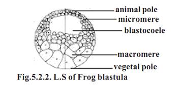 5-As a result of further cleavages, a ball of several small blastomeres result. A closer observation reveals that, while the blastomeres above the equator are small and remain as micromeres, the blastomeres of the vegetal pole re-main progressively larger. The larger blastomeres are called the macromeres