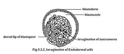 Initially, the first pharyngeal endodermal cells undergo invagination over the dorsal blastoporal lip. These cells move to the interior. They are followed by other cells. The inwandering cells gradually occupy the region of the blastocoele. Thus the blastocoelic cavity gets reduced. A new cavity among the involuted cells results. It is called the gastrocoel. The gastrocoel later becomes the archenteron. The interior region of the archenteron gradually transforms into the pharyngeal region. This region remains as the foregut. The mesodermal and endodermal cells gradually occupy their positions.
