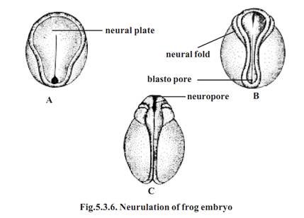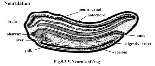 During neurulation the embryo lengthens along the anteroposterior axis. The dorsal side of the gastrula is lined by ectodermal cells. The presumptive area of the nervous system gets differentiated from the rest of ectoderm. It remains as medullary plate or nerual plate. The neural plate later thickens and it gets raised above the general level as ridges called neural folds. In the middle of the neural fold a neural groove appears. The neural groove deepens inside. The neural folds above the groove. The neural groove gets converted into a neural tube. This tube gets detached from the surface. The neural tube remains as the prospective nervous system. The embryo at this stage is called the neurula.