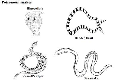 Indian poisonous snakes are the cobras, the kraits, the vipers and the sea snakes. These can be distinguished from the non-poisonous by the tail, the arrangement and size of scales, plates and shields found over the body.
