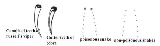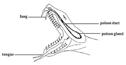 The poisonous snake possesses a poison apparatus comprising of a pair of poison glands, a pair of poison ducts and a pair of fangs. The poison glands are situated on either side of the upper jaw below and behind eyes. They are specialized salivary glands. A duct carries the venom secreted from each gland to the fang. A fang is meant for injecting the venom into the body of the prey. Fangs are specialized teeth of the upper jaw which are tubular or grooved.