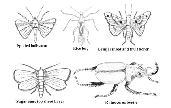 Any animal which becomes a source of trouble or loss to human is called a pest. Among insects such pests are numerous and are of different kinds. An insect is usually called as a pest when it causes appreciable damage and loss to the crops or other belongings. The pests may be classified as major or occasional. The insects damaging standing crops cereals, fruits and other plant products of commercial importance are designated as crop pests. Those insects destroying stored grains are called the store pest. Insects causing damage to household articles are called the household pests.