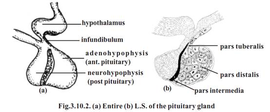 Based on origin and function the pituitary is divided into two parts. They are the posterior pituitary or neurohypophysis and anterior pituitary or adenohypophysis.
