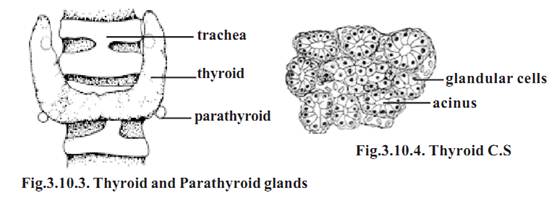 The gland is composed of numerous follicles. They are small spheres. Their walls are made up of cuboidal epithelial cells. The central cavity or lumen of each follicle is filled with a protein called the thyroglobulin. It stores large amount of thyroid hormone. The thyroid secretes thyroxine and calcitonin.