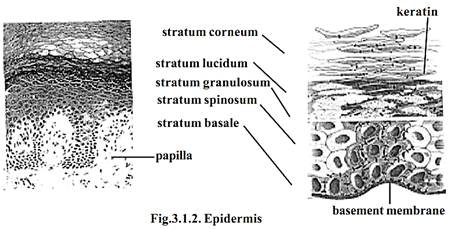 Epidermis: - The epidermis is made up of stratified squamous epithelium. It is separated from the dermis by a basement membrane. It contains melanocytes giving colour to the skin. Many of the cells of the epidermis produce a protein substance called keratin. Hence they are called as keratinocytes.