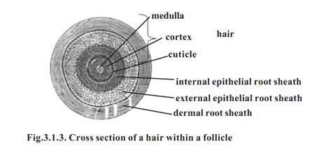 Hair: - The hairs are integumentary structures. A hair has a root and a shaft. While the shaft projects above the skin, the root remains well below the surface. The base of the root has a hair bulb. It is an expanded region. The shaft and most of the root of the hair are formed of dead keratinized epithelial cells. These are arranged in three concentric layers called the medulla, the cortex and the cuticle. The central axis of the hair is formed of the medulla. Major part of the hair is formed of a single layer of cells.