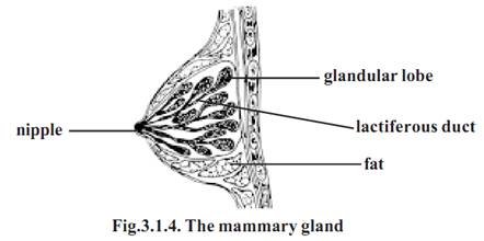 The skin has sebaceous glands and the sweat glands. The sebaceous glands are located in the dermis. They produce an oily substance called the sebum. These glands are connected by a duct to the upper part of the hair follicles. The mammary glands are the modified sweat glands.