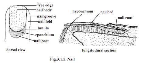 The stratum comeum of the nail fold grows onto the nail body as the eponchium. The free edge of the nail body is the hyponchium. The nail is found placed on the nail matrix and nail bed. A small white region seen at the base of the nail is the lunula. It contains the nail matrix. The nails grow at an average rate of 0.5-1.2 mm per day.