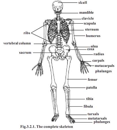 Dried, prepared bones are used to study skeletal anatomy. The bones are named according to their position in the body. The named bones are divided into two categories: (1) the axial skeleton and (2) the appendicular skeleton. The axial skeleton consists of the skull, hyoid bone, vertebral column and thoracic cage. The appendicular skeleton consists of the limbs and their girdles. In human body, there are 206 bones, of these 80 are in the axial skeleton, 126 in the appendicular skeleton. Among the bones of the axial skeleton 28 bones are in the skull, 26 bones in the vertebral column, 25 bones in the thoracic cage and one remains as the hyoid bone. (Details as found below)