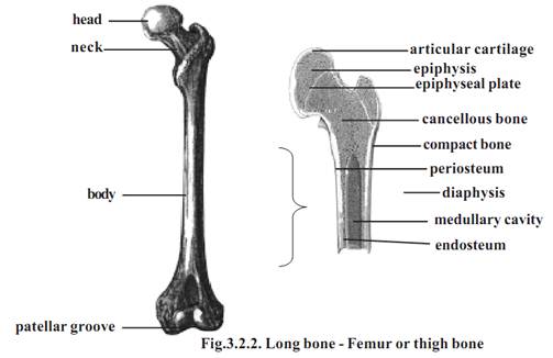 A growing long bone has three regions. The long bony part is the dia- physis or shaft. It is made up of compact bone.