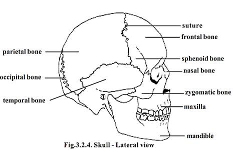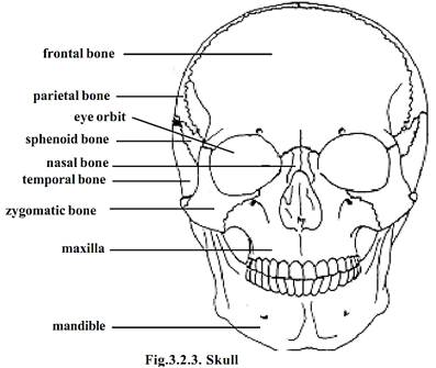 a) Skull - The human cranial capacity is about 1500 cm3. It consists of 22 bones. It protects the brain. It supports the organs of vision, hearing, smell and taste. The lower jaw or mandible remains specially attached to the skull. The skull or cranium is covered by eight bones. They are one pair each of parietal and temporal, individual bones as frontal, sphenoid, occipital and ethmoid. These bones are joined by sutures to form a compact box like structure. The sutures are immovable