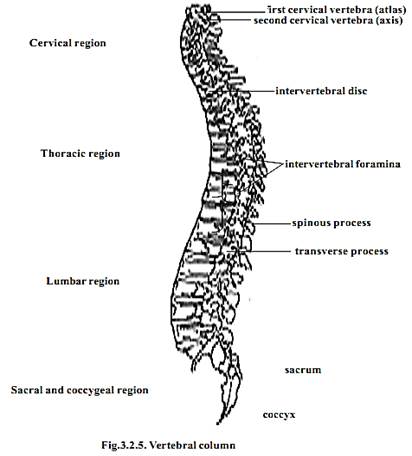 b) Vertebrae - The vertebrae make up the slight S-shaped vertebral column or backbone. The vertebral column consists of 26 bones. They are divided into 5 regions. They are the cervical (7), thoracic (12), lumbar (5), sacral (1) and coccygeal (1) vertebrae.