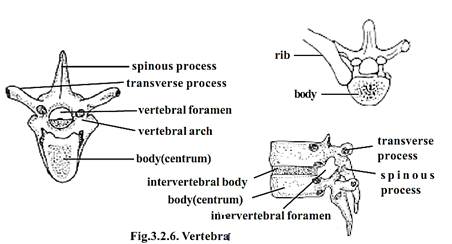 Vertebra - Structure: The main load - bearing portion of a vertebra is a solid disc of bone called the centrum. The central of adjacent vertebrae are separated by intervertebral discs of cartilage. Projecting from the centrum dorsally is a vertebral arch. It encloses the neural canal. This canal contains the spinal cord. Several bony projections are seen on the vertebral arch. On of muscles. Further, there are two superior and two inferior processes meant for articulation with the neighboring vertebra.