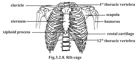 c) Rib cage - There are 12 pairs of ribs. Each articulates with a thoracic vertebra. In the front, the first ten pairs are attached to the sternum (breast bone) by costal cartilages. The first seven are attached directly to the ster-num. They are called the true ribs. Cartilages of 8th, 9th and 10th ribs are fused and attached to 7th. They are called the false ribs. 11th 12th pairs are not attached to the sternum. They are called floating ribs.