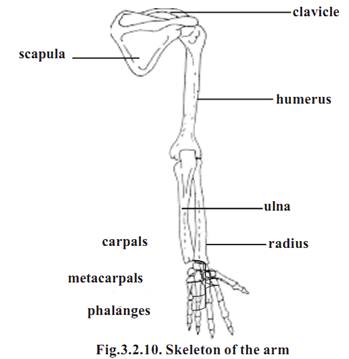 Upper limb or hand - The part of the upper limb from shoulder to the elbow is the arm. It contains one long bone called the humerus. The head of humerus articulates with the glenoid fossa of the scapula. The distal end of the bone articulates with the two forearm bones.