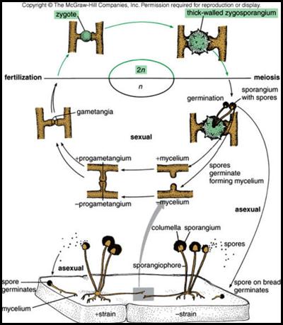 This phylum contains about 600 described species that are mostly terrestrial in habitat, living in soil or on decaying plant or animal material. This division has coenocytic mycelium, asexual reproduction is by non- motile spores (=sporangiospores) that are produced in sporangia borne on stalks (=sporangiophores). Zygomycota, like all true fungi, produce cell walls containing chitin. They grow primarily as mycelia, or filaments of long cells called hyphae. Their name is derived from their way of reproducing sexually. The principal characteristic that distinguishes this class is the production of a thick walled resting spore called a zygospore. The zygospore develops inside a zygosporangium that is formed after fusion or conjugation - of morphologically similar two gametangia (structures containing gametes).