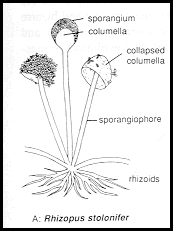 One of the commonest mucoraceous mould, it is abundant on damp bread and rotting fruit. the sporangia appear black. This mould produce fast- growing aerial hyphae (stolon) which arch over and touch down on a solid surface a head of the main mycelium, close to its point contact the stolon forms a tuft of root- like hyphae ( rhizoids).. From the region where the rhizoids formed, one to several short, stiff sporangiophores are formed. the sporangiospore released when the wall of the columellate sporangium disintegrates. Under favorable conditions a spore germinates by germ tube which develops into a fluffy, many branched, white, aerial mycelium. sexual reproduction is by mean of gametangial copulation. Colonies are fast growing and cover an agar surface with a dense cottony growth that is at first white becoming grey or yellowish brown with sporulation.
