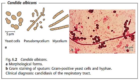Morphology and culture. Gram staining of primary preparations reveals C. albicans to be a Gram-positive, budding, oval yeast with a diameter of approximately 5 µm. Gram-positive pseudohyphae are observed frequently and septate mycelia occasionally (Fig. 6.2).
